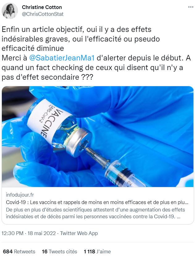 "Les vaccins et rappels [sont] de moins en moins efficaces et de plus en plus nocifs", avance le titre d'un article publié sur le site "infodujour.fr" et partagé sur les réseaux sociaux au moins 3.800 fois depuis le 16 mai. Il comporte un entretien avec Jean-Marc Sabatier, présenté en tant que "directeur de recherches au CNRS et docteur en biologie cellulaire et microbiologie".