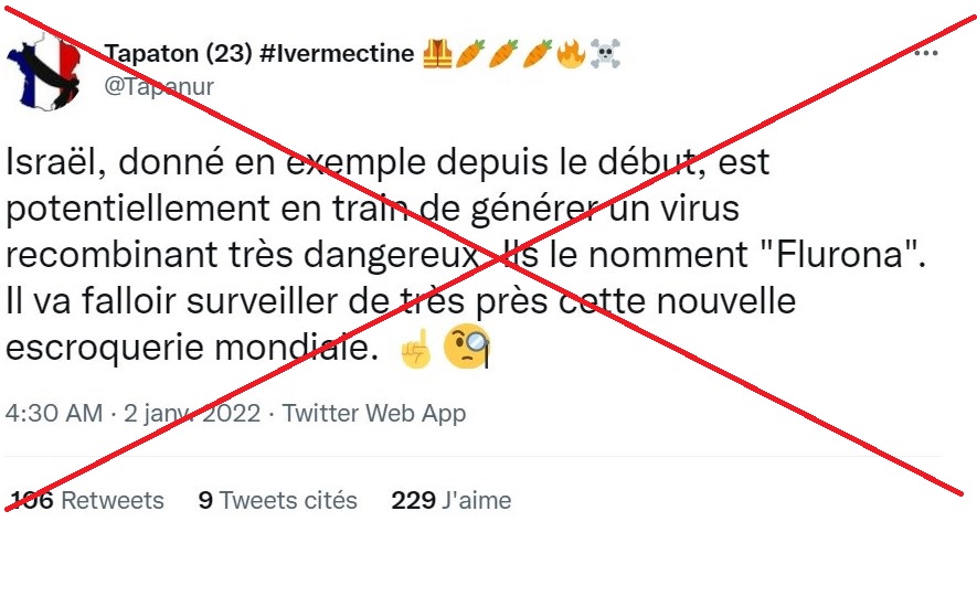 Cet autre tweet très viral posté le 1er janvier parle quant à lui de "fusion entre la #grippe et le #coronavirus, appelé « #flurona » a été détecté en #Israël".