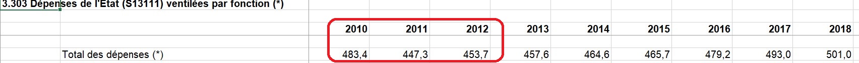 Si l'on s'en tient aux dépenses de l'Etat stricto sensu, un repli a bien été observé en 2011 par rapport à 2010 (de 483,4 à 447,3 milliards d'euros) même s'il a été de courte durée puisqu'elles sont reparties à la hausse dès 2012, à 453,7 milliards d'euros, selon les données de l'Insee.