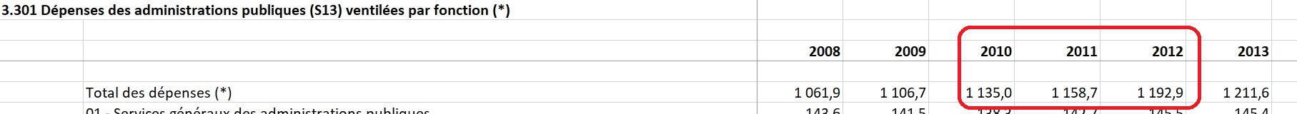 Les dépenses publiques dans leur ensemble (Etat, collectivités, Sécurité sociale) n'ont elles pas connu de repli pendant cette période et sont passées de 1.135,0 milliards d'euros en 2010 à 1.192,9 milliards en 2012, année de l'élection de François Hollande.
