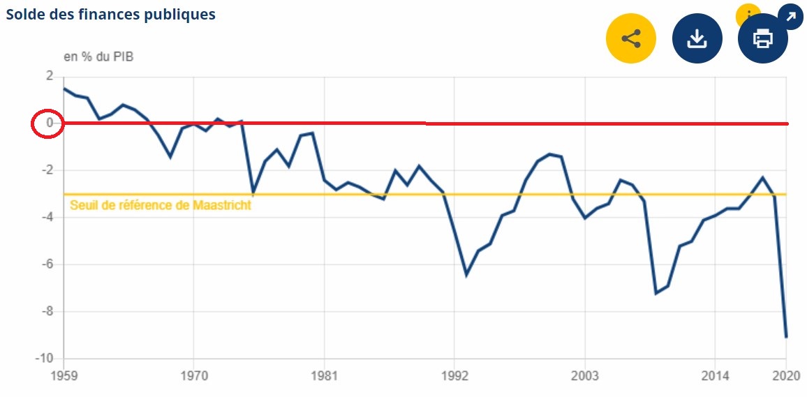Cette affirmation est contredite par une réalité statistique intangible : les comptes publics de la France sont dans le rouge sans discontinuer depuis 1974. Concrètement, cela veut dire que les dépenses de l'Etat, des collectivités locales et de la Sécurité sociale sont chroniquement supérieures aux recettes, générant un déficit qui s'exprime soit en milliards d'euros soit en pourcentage du produit intérieur brut (PIB).