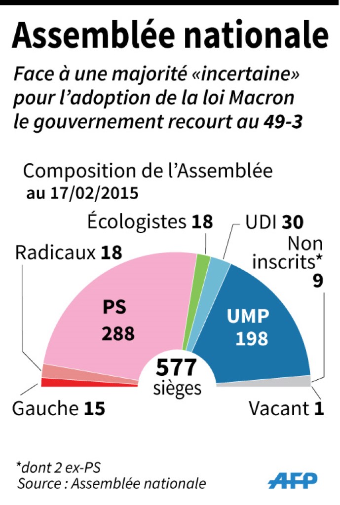 Le 17 février 2015, c'est l'heure du vote en première lecture à l'Assemblée et la stratégie du compromis a du plomb dans l'aile. Craignant un vote défavorable de 30 à 40 frondeurs socialistes, le gouvernement de Manuel Valls a recours à l'article 49-3 de la Constitution: aucun vote n'est alors nécessaire et le projet de loi est considéré comme adopté à moins qu'une motion de censure, déposée dans les 24 heures, soit votée par une majorité de députés. Dénonçant un "passage en force", l'UMP déposera une motion de censure qui sera sans surprise rejetée.