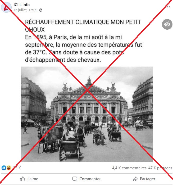 Sur Facebook, des internautes français et belges semblent questionner cette réalité scientifique en partageant une photo de la place de l'Opéra à Paris, accompagnée de cette légende ironique: "RECHAUFFEMENT CLIMATIQUE MON PETIT CHOUX (sic). En 1895, à Paris, de la mi août à la mi septembre, la moyenne des températures fut de 37°C. Sans doute à cause des pots d'échappement des chevaux". Cette photo a été partagée plusieurs dizaines de milliers de fois depuis mi-juillet 2022.
