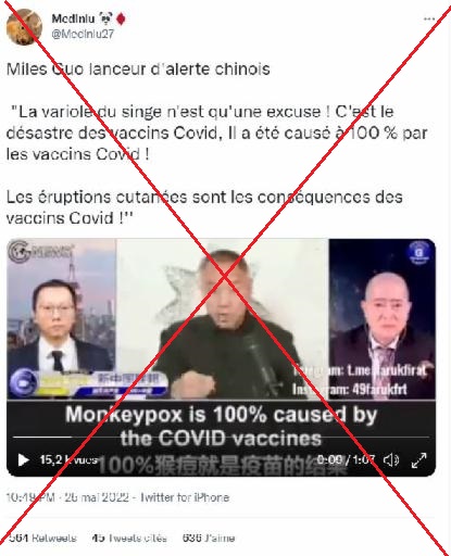 "La variole du singe n'est qu'une excuse ! C'est le désastre des vaccins Covid, il a été causé à 100 % par les vaccins Covid. Les éruptions cutanées sont les conséquences des vaccins Covid !", avance un internaute dans un tweet publié le 25 mai et partagé plus de 1.200 fois depuis (1, 2).