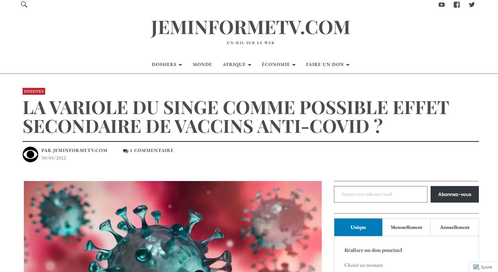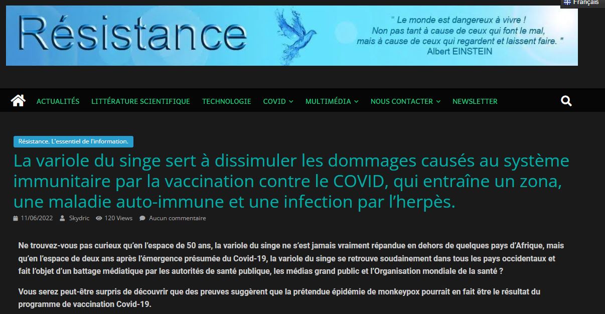 "La variole du singe sert à dissimuler les dommages causés au système immunitaire par la vaccination contre le COVID, qui entraîne un zona, une maladie auto-immune et une infection par l’herpès", prétend encore un article de blog publié le 1 juin sur le site Résistance.