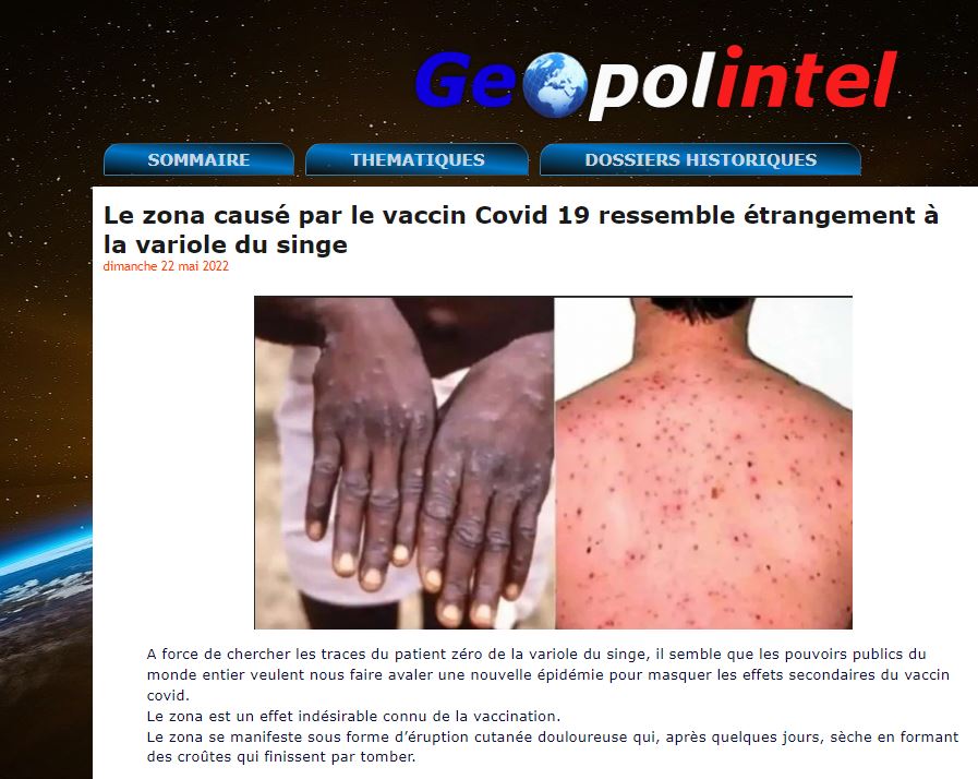 "Le zona causé par le vaccin Covid-19 ressemble étrangement à la variole du singe", titre de son côté un article de blog du site Geopolintel.