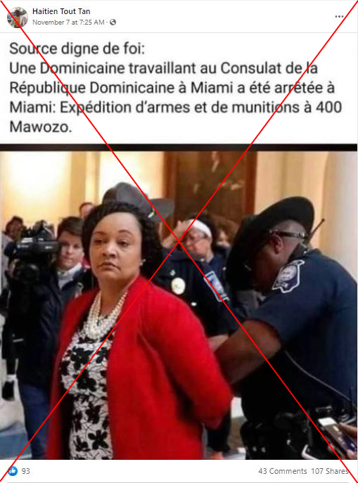 "Source digne de foi: Une Dominicaine travaillant au Consulat de la République Dominicaine à Miami a été arrêtée à Miami: Expédition d’armes et de munitions à 400 Mawozo", assure un poste Facebook, publié le 7 novembre 2021 et qui circule en Haïti, associant l'histoire à la photo d'une femme semblant être arrêtée par un policier.