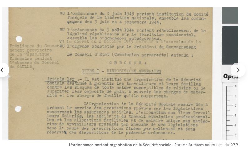 La création du régime général de la Sécurité sociale est actée par la signature des ordonnances des 4 et 19 octobre 1945, qui met en place le programme du Conseil national de la Résistance et ses promesses de "jours heureux", lors du premier Gouvernement provisoire de la République française (GPRF) présidé par le général de Gaulle.