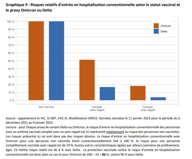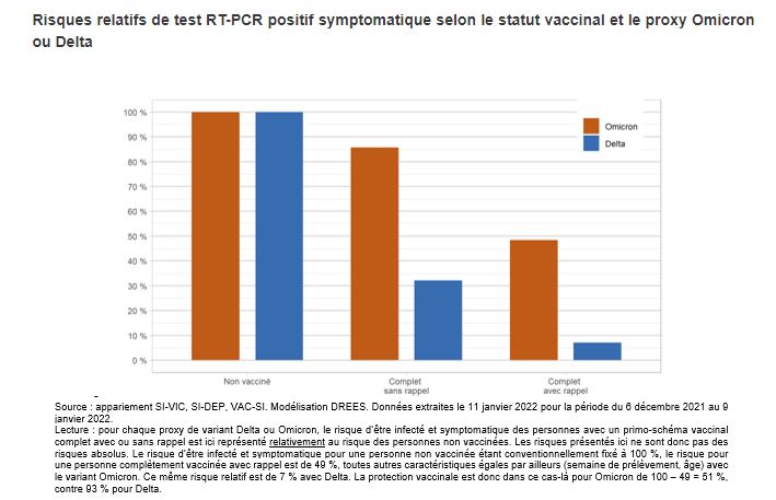 Elle conclut que pour les personnes présentant un schéma vaccinal complet (sans rappel), le risque relatif d'être infecté et symptomatique descend à 85% pour Omicron et à environ 30% pour Delta.