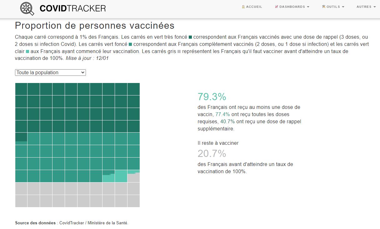 Capture d'écran de la couverture vaccinale anti-Covid en France prise le 15/01/2022 sur le site CovidTracker