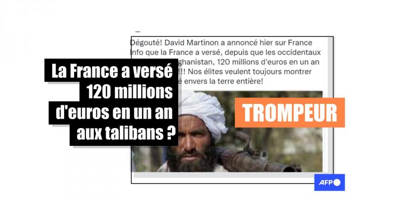 Dans ce tweet viral, un utilisateur affirme, "dégoûté", que la France "a versé, depuis que les occidentaux ont quitté l'Afghanistan, 120 millions d'euros en un an aux talibans". La publication a également été partagée sur Facebook (ici, ici).