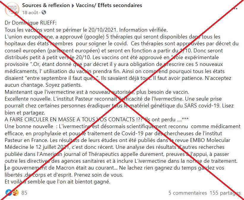 "Maintenant que l'ivermectine est à nouveau autorisée, plus besoin de vaccin (...) L'institut Pasteur reconnaît l'efficacité de l'ivermectine. Une seule prise pourrait chez certaines personnes éradiquer tous le matériel génétique du SARS covid-19 (sic)", selon l'auteur de la publication, qui évoque "des études" publiées dans la revue EMBO Molecular Medicine le 12 juillet 2021.