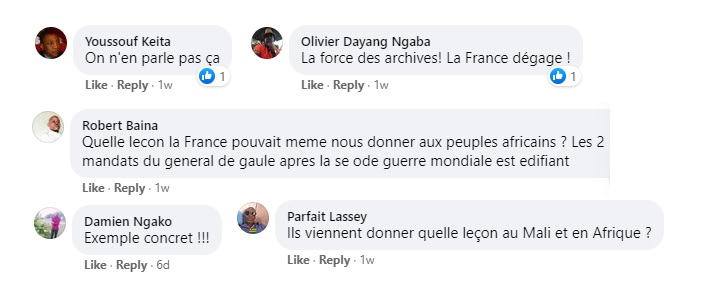 "On n'en parle pas ça", approuve l'un d'entre eux; "Ils viennent donner quelle leçon au Mali et en Afrique?", interroge un autre. "La forces des archives! La France dégage!", s'indigne un autre.