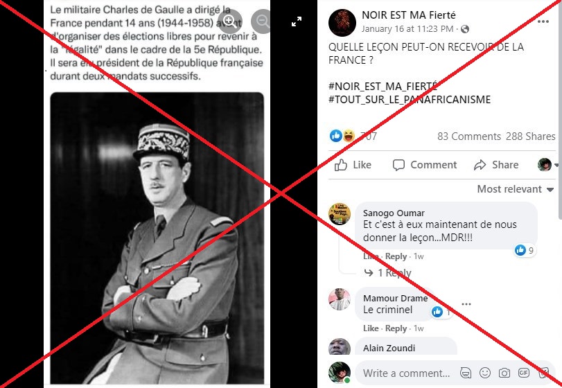 Selon les nombreux internautes qui commentent ces publications partagées plus de 600 fois depuis le 16 janvier (1, 2, 3, 4...), la France appliquerait une politique de "deux poids, deux mesures" en critiquant la junte, puisque le général de Gaulle aurait "dirigé la France pendant 14 ans" sans élections.