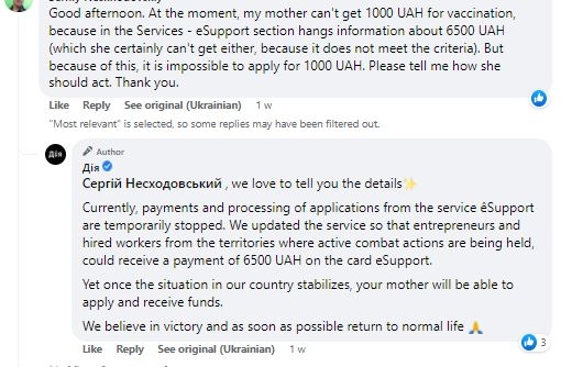 Un administrateur de la page Facebook de l'application Diya le 18 mars 2022 a indiqué que le support "ePidtrymka" avait été mis à jour pour servir, désormais, au versement de l'allocation chômage pendant le conflit.