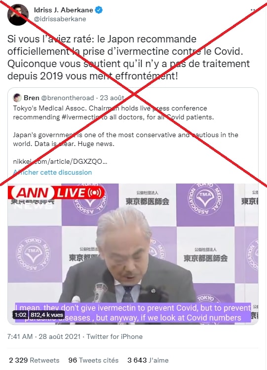 "Si vous l'aviez raté: le Japon recommande officiellement la prise d'ivermectine contre le Covid. Quiconque vous soutient qu'il n'y a pas de traitement depuis 2019 vous ment effrontément! ", affirme un internaute sur Twitter dans une publication partagée plus de 2.300 fois depuis le 28 août, qui contient une vidéo du Dr. Haruo Ozaki, président de l'Association médicale de Tokyo.