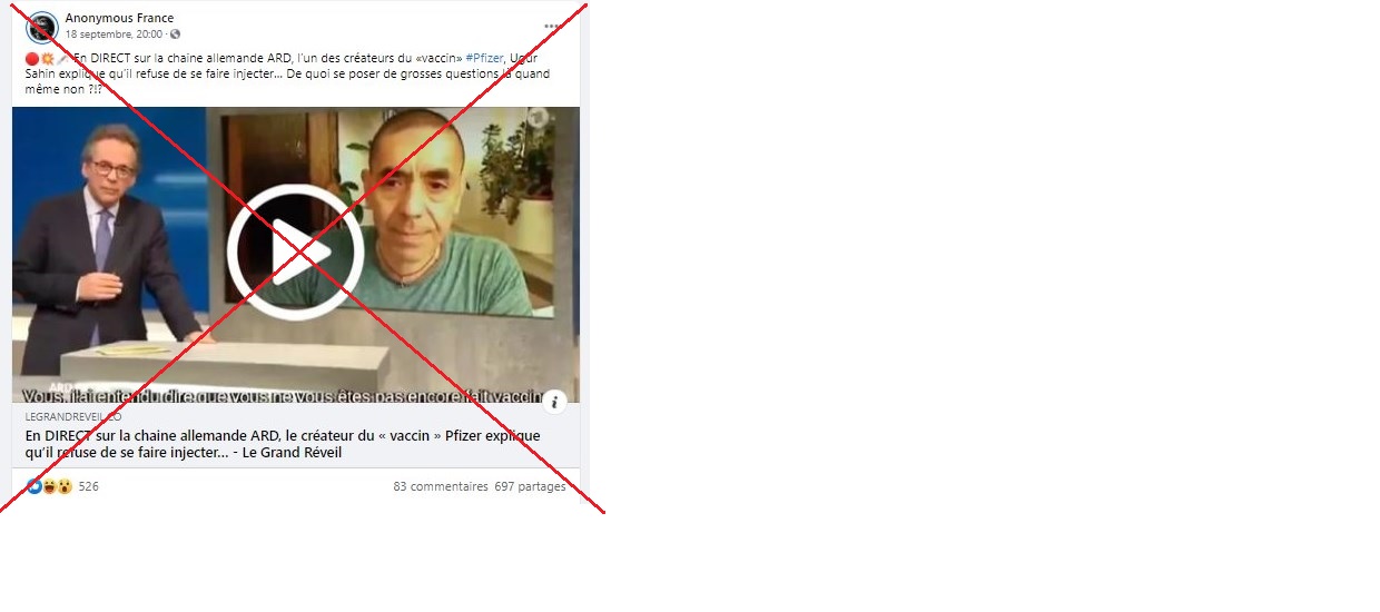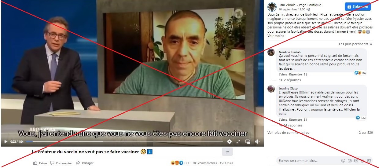 L'extrait de l'interview dure 1'04: on y voit un journaliste posant en allemand une question à Ugur Sahin. Cette publication Facebook postée le 16 septembre 2021 par la page de "Paul Zilmia" (candidat La France Insoumise aux municipales à Roubaix en 2020) compte plus de 153.000 vues, près de 800 commentaires et 8.000 partages.