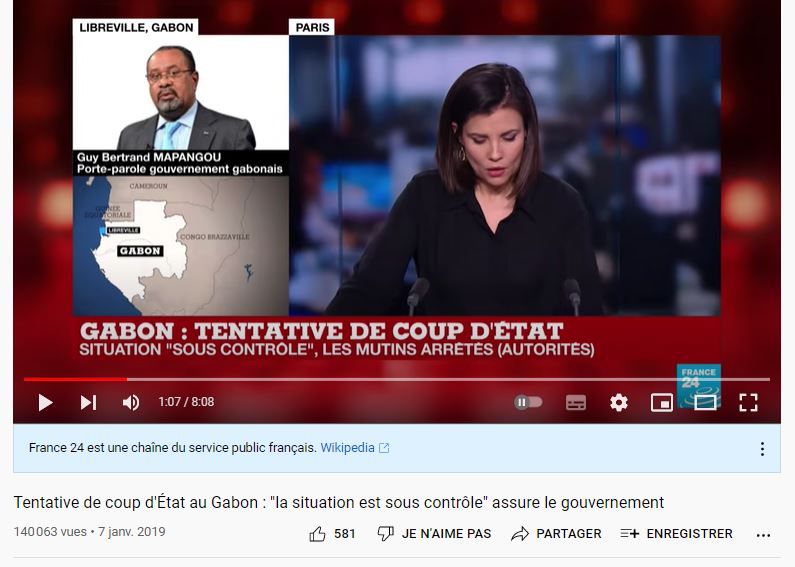 Le bandeau original titrait "GABON - TENTATIVE DE COUP D'ETAT" et affirmait que la "situation [était] sous contrôle', les mutins arrêtés" selon les autorités.
