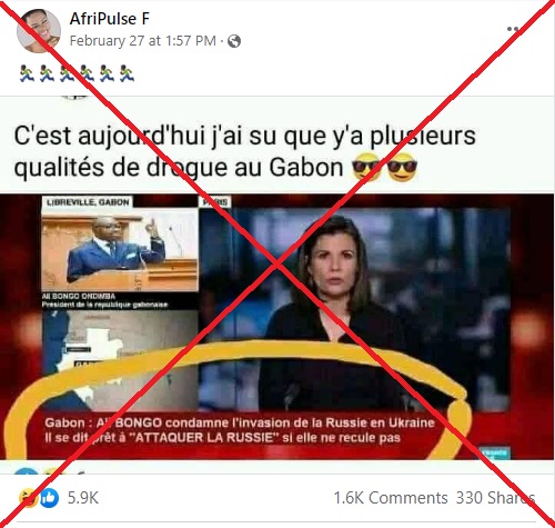 Des publications prétendant montrer une capture d'écran de la chaîne de télévision France 24 circulent sur Facebook en Afrique. On y voit une présentatrice qui semble interviewer le président du Gabon Ali Bongo et un bandeau affirmant qu'il se tient prêt à "attaquer la Russie" si elle ne se retire pas de l'Ukraine. Attention: il s'agit d'un montage. France 24 a déclaré à l'AFP ne pas avoir réalisé d'entretien avec Ali Bongo depuis le début de cette guerre et le porte-parole du gouvernement gabonais évoque une "fake news".