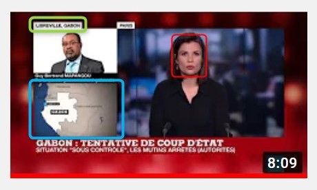 La présentatrice, Elisabeth Allain, porte en effet exactement la même tenue et arbore la même expression (en rouge ci-dessous) que sur la vignette servant à illustrer la vidéo sur la chaîne YouTube de France 24. Le bandeau indiquant "Libreville - Gabon" (en vert) ainsi que la carte du pays (en bleu) sont également identiques.