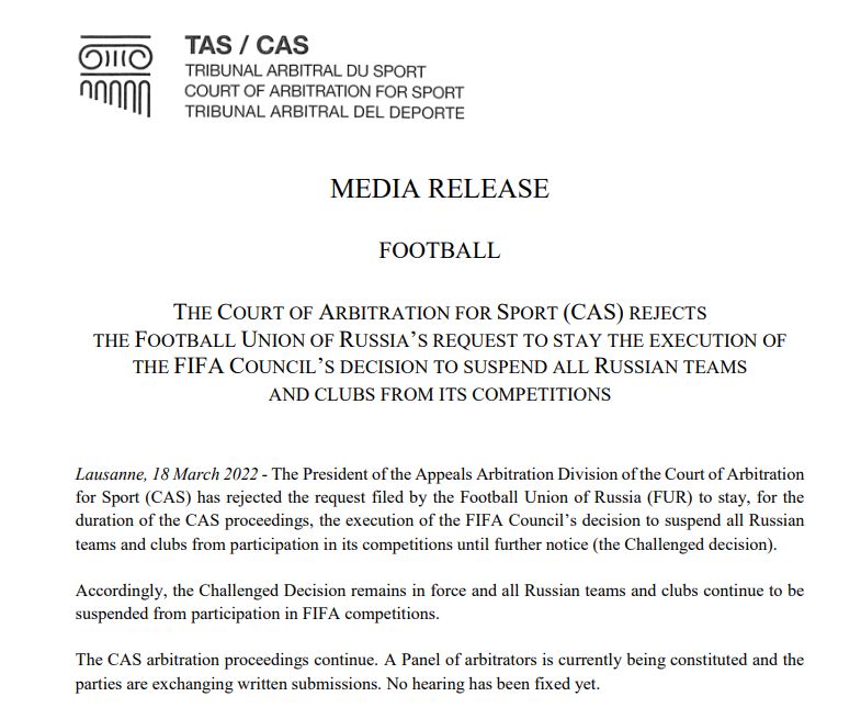 Début mars, la Fédération russe de football a saisi le Tribunal arbitral du sport, par deux procédures distinctes, pour faire annuler les sanctions de la Fifa et de l'UEFA. En attendant que ce conflit soit tranché sur le fond, ce qui prendra au minimum plusieurs semaines, les Russes ont demandé au TAS de "suspendre provisoirement" les décisions des deux instances, pour permettre à leurs équipes de reprendre les compétitions.