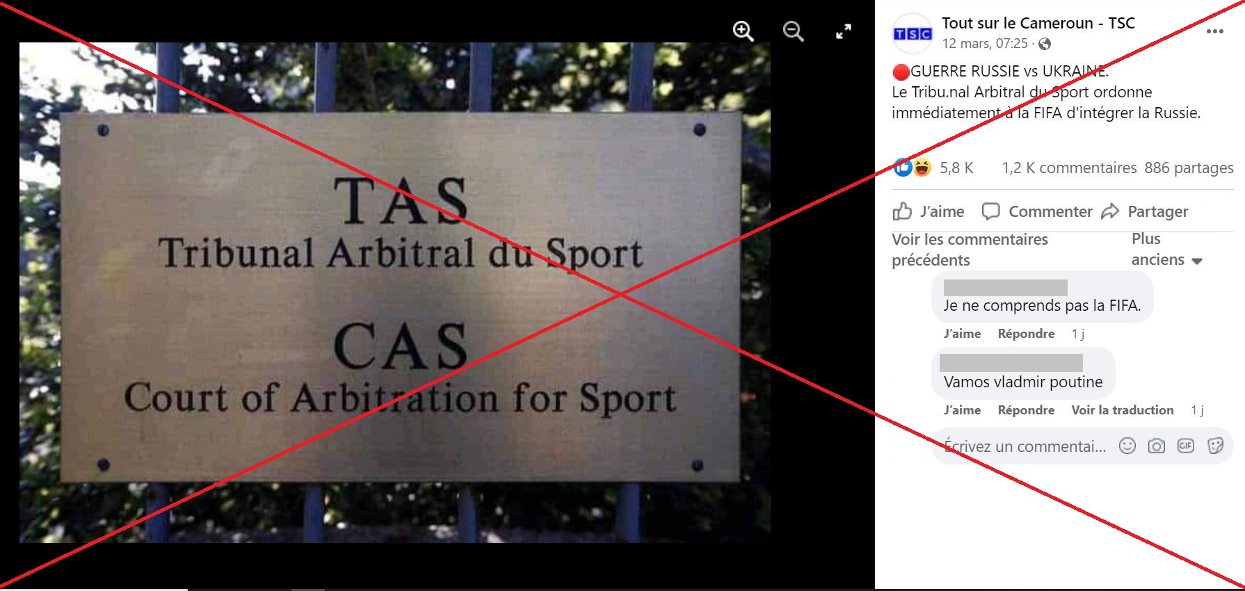 "GUERRE RUSSIE vs UKRAINE. Le Tribunal Arbitral du Sport ordonne immédiatement à la Fifa d'intégrer la Russie", affirme une publication concernant le contentieux qui oppose la Russie à l'instance mondiale du football. Cette publication a été relayée par plusieurs comptes et pages sur Facebook (1, 2, 3, 4).