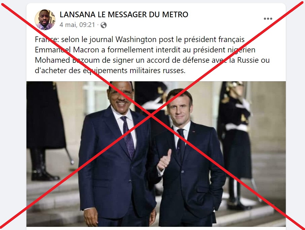 L’affirmation a été partagée des centaines de fois depuis début mai, d’abord par des comptes Facebook basés au Mali puis dans d’autres pays de l’Afrique de l’Ouest (1, 2, 3). " NIGER / FRANCE : MACRON MET EN GARDE LE NIGER CONTRE UN ACCORD MILITAIRE POSSIBLE AVEC LA RUSSIE ", est-il écrit en tête de plusieurs publications. Cette soi-disant information viendrait du Washington Post, l’un des quotidiens américains les plus respectés. Emmanuel Macron aurait " formellement interdit au président nigérien Mohamed Bazoum de signer un accord de défense avec la Russie ou d'acheter des équipements militaires russes ". Sous le texte figurent des photos des deux présidents.