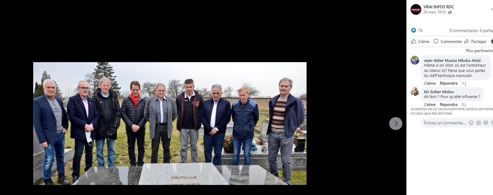 "Avant de prendre la direction de la RDC, le staff technique de l’équipe du Maroc s’est recueilli sur la tombe du maréchal Mobutu", affirme l'auteur d’une publication partagée plus de 250 fois sur Facebook depuis le 26 mars. Trois images accompagnent cette légende commentée des dizaines de fois et partagée sur Whatsapp, Twitter, Facebook. L’une d’elle montre neuf personnes, tête baissée, devant une pierre tombale. Les deux autres clichés montrent un tombeau et le portrait de Mobutu Sese Seko, le très controversé président de l’ex-Zaïre (devenu la République démocratique du Congo), mort en exil au Maroc en septembre 1997 et enterré à Rabat.