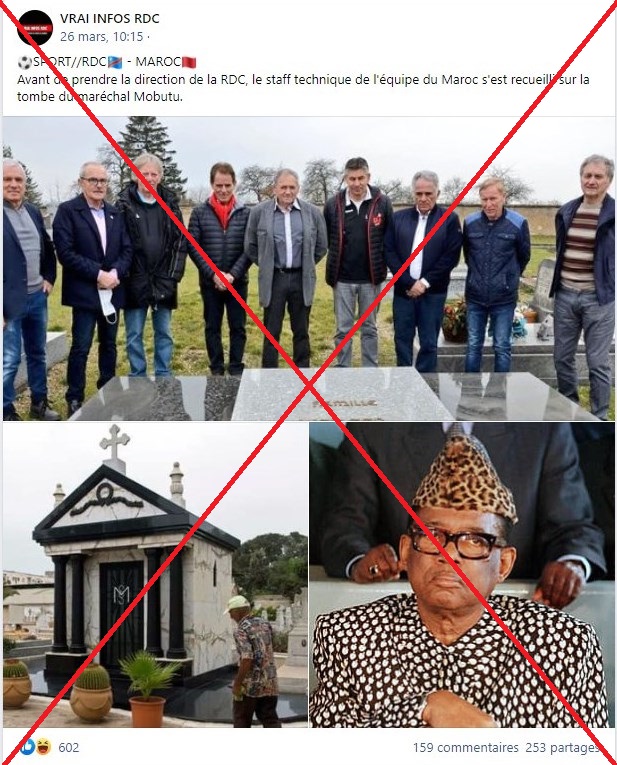Un message devenu viral le 25 mars 2022 en République démocratique du Congo (RDC) prétend qu'avant la rencontre de football opposant ce jour là le Maroc à la RDC, le staff technique de l'équipe marocaine s'est recueilli sur la tombe de l'ex-dictateur congolais Mobutu Sese Seko, à Rabat. Mais la fédération de football du Maroc dément. De plus, l'image censée montrer les Marocains devant la sépulture de Mobutu est ancienne et n'a rien à voir avec la sélection marocaine de football.