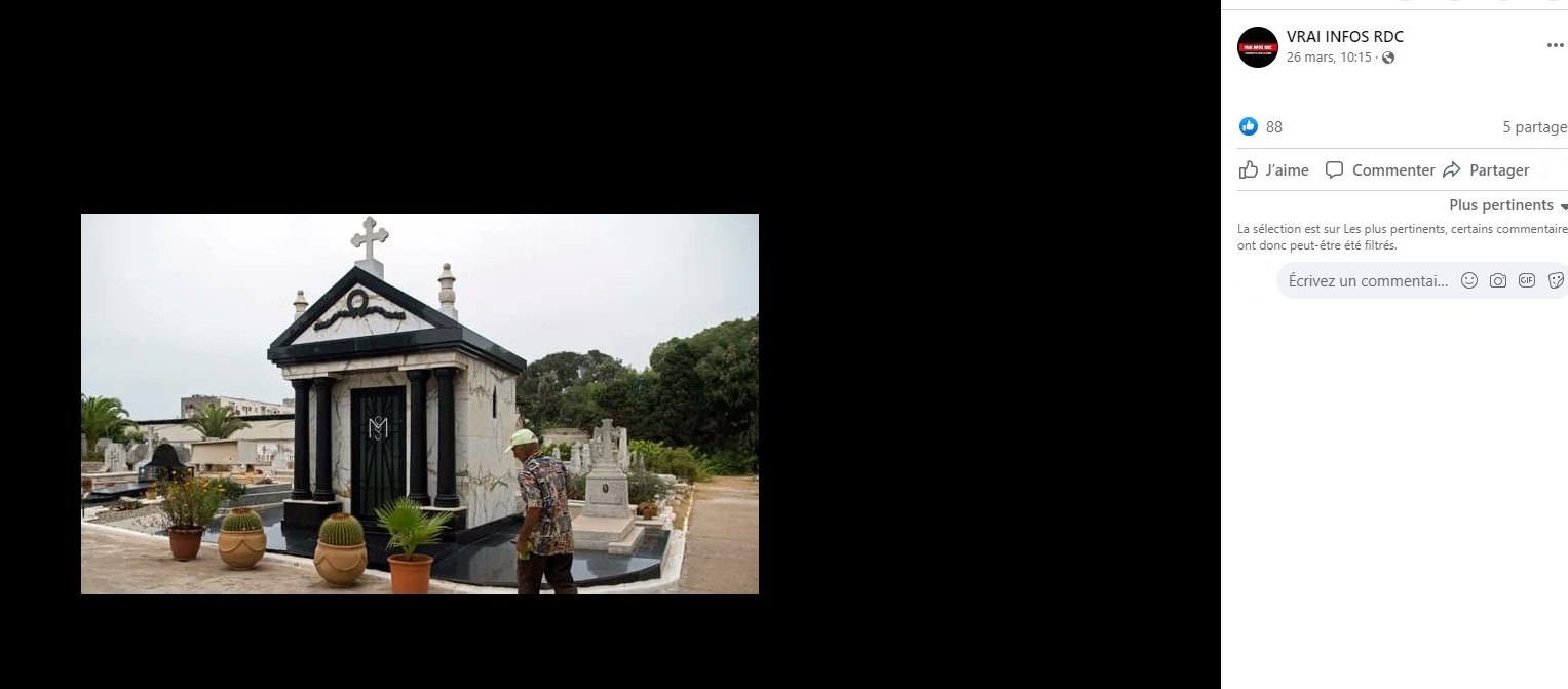 La troisième image des publications virales, celle d'un tombeau, montre bien le caveau de Mobutu. Il s'agit d'ailleurs d'une photo prise par l'AFP le 3 septembre 2017 pour évoquer la dépouille de Mobutu qui attend toujours son retour en RDC.