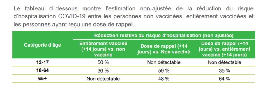 La mention "non détectable", qui apparaît dans les tableaux de Sciensano, peut en fait avoir deux significations différentes, a expliqué à l'AFP Joris van Loenhout: "la première, c'est si on a décidé de ne pas calculer la réduction (d'infection ou d'hospitalisation) liée au vaccin, parce qu'on considère que ce n'est pas pertinent. Par exemple, le vaccin n'est pas recommandé aux moins de 5-11 ans et le booster n'est pas recommandé pour les 12-17 ans. On n'évalue donc pas la réduction du risque pour ces tranches d'âge". La mention "non détectable" est également indiquée "si on ne voit pas de réduction du risque basée sur le calcul de la RRR".