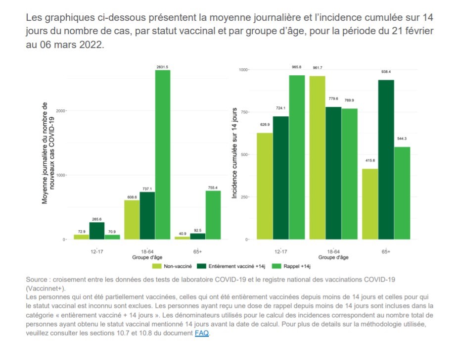 Voici ci-dessous les deux graphiques présentés par Christophe de Brouwer dans l'extrait vidéo. Le graphique de gauche présente le nombre de cas d'infection par le Covid, en fonction du statut vaccinal, pour la période du 21 février au 6 mars 2022.