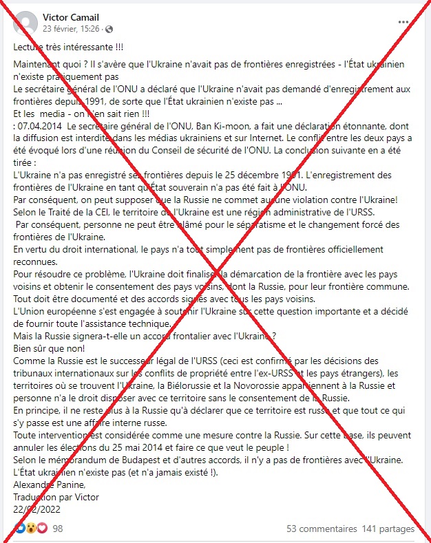 Ces assertions ont été partagées en ligne dans le contexte de l'invasion russe de l'Ukraine le 24 février 2022. Elles soutiennent qu'en 2014, le secrétaire général des Nations unies Ban Ki-moon avait confirmé que l'Ukraine n'avait pas demandé à enregistrer ses frontières et n'existait pas en tant qu'Etat souverain. Ces publications affirment de manière trompeuse que le traité de la Communauté des Etats indépendants (CEI) de 1991, qui achevait la dissolution de l'Union soviétique, dépeignait "le territoire de l'Ukraine" comme "une région administrative de l'URSS".