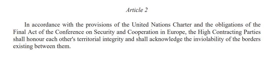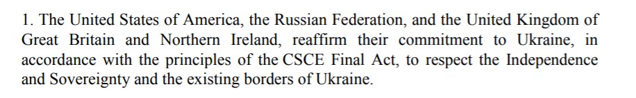 Signé le 5 décembre 1994 à Budapest, le mémorandum comprend des garanties de sécurité en relation avec la décision de l'Ukraine de renoncer à son arsenal nucléaire. Dans son article 1, les signataires - dont la Russie - s'accordent à "respecter l'indépendance, la souveraineté et les frontières existantes de l'Ukraine". Dans l'article suivant, ils s'accordent également à "s'abstenir de recourir à la menace ou à la force contre l'intégrité territoriale ou l'indépendance politique de l'Ukraine".