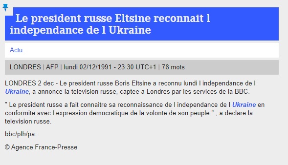 L'Ukraine a voté massivement en faveur de son indépendance vis-à-vis de l'Union soviétique, alors en voie d'effondrement, lors d'un référendum tenu le 1er décembre 1991. Le président russe Boris Eltsine a reconnu son indépendance le jour suivant, comme l'a rapporté l'AFP.