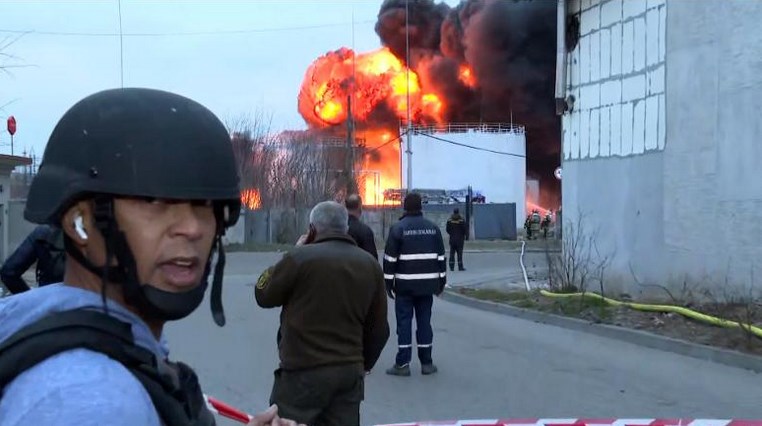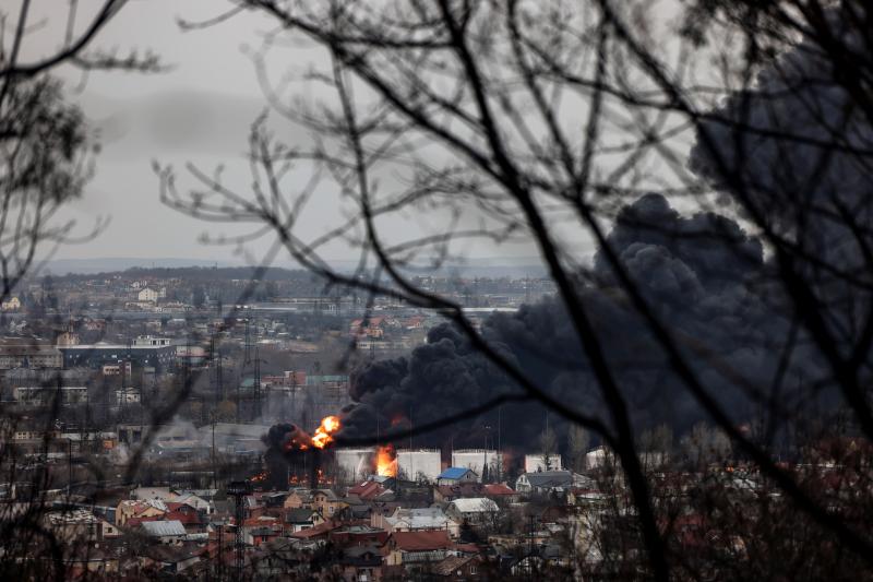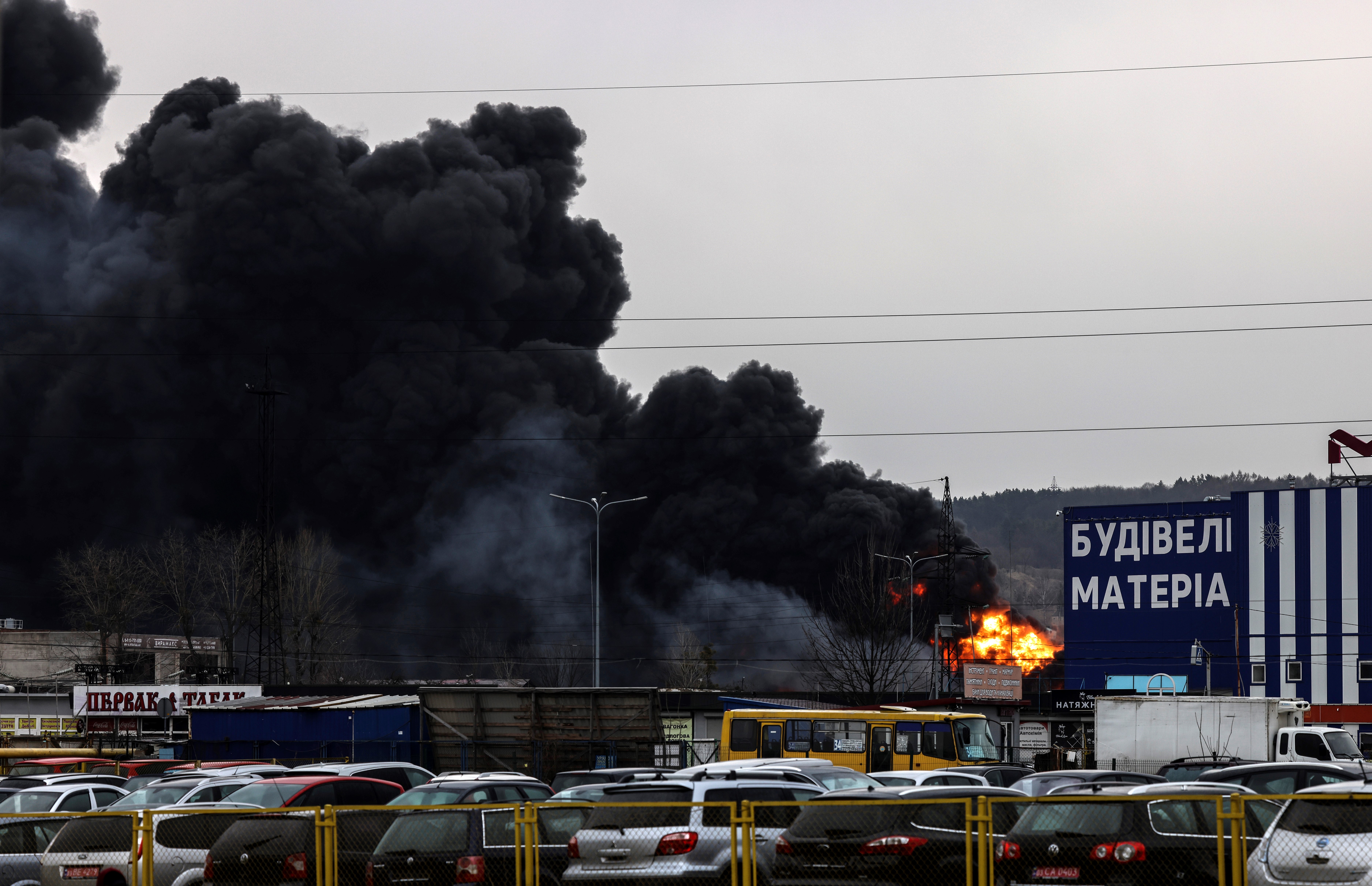 L'incendie qui fait l'objet du reportage de CNN est également visible sur les photographies prises par l'AFP à Lviv le 26 mars 2022.