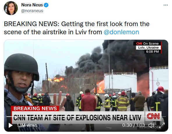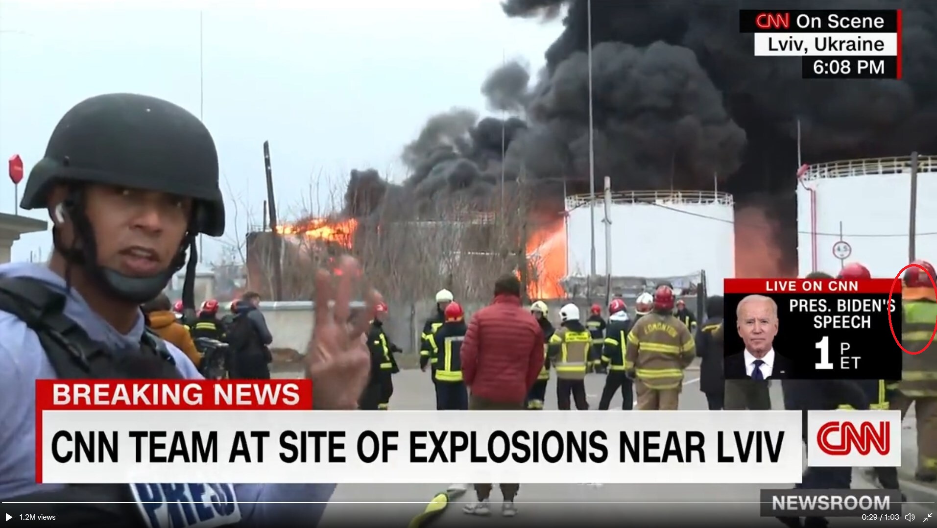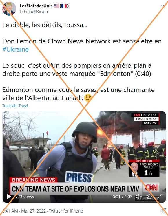 Des publications sur les réseaux sociaux partagent depuis le 27 mars une capture d'écran de la chaîne de télévision américaine CNN montrant un incendie près de la ville ukrainienne de Lviv et suggèrent que la scène a en réalité été filmée au Canada car l'un des pompiers porte une veste où l'on peut lire le nom de la ville canadienne d'Edmonton. Mais attention : cette veste a été envoyée par une association canadienne qui donne du matériel aux pompiers ukrainiens depuis plusieurs années, selon l'association et les pompiers d'Edmonton. L'AFP a également géolocalisé le lieu de l'incendie à Lviv et des photographies prises sur place confirment que la scène a bien eu lieu en Ukraine.
