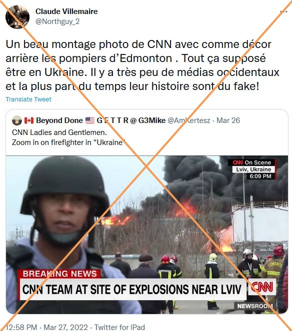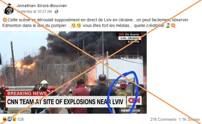 "Cette scène se déroulait supposément en direct de Lviv en Ukraine , on peut facilement observer Edmonton dans le dos du pompier ... vous êtes fort les médias... quelle crédibilité", peut-on lire dans une publication partagée plus de 1.200 fois sur Facebook depuis le 27 mars 2022.
