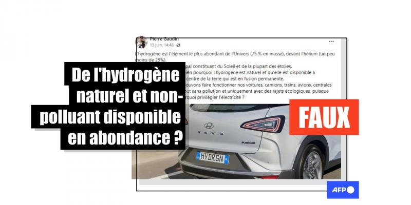L’hydrogène est-il une source d’énergie naturelle et non-polluante, présente en abondance sur Terre, à même de faire fonctionner nos moyens de transports et nos centrales électriques ? C’est ce que prétend un post Facebook relayé ces derniers jours, qui affirme que l’hydrogène est "naturel" et "disponible à profusion" sur la planète, vantant les seuls "rejets écologiques" de son utilisation. Cette assertion est à nuancer sérieusement : s'il est présent en grande quantité dans l'univers, cet élément n'existe quasiment pas à l'état pur sur Terre. Par ailleurs, tel qu’il est actuellement produit à échelle industrielle, l’hydrogène génère par sa fabrication des gaz à effet de serre responsables du réchauffement climatique. C'est ce qu'ont expliqué à l'AFP des spécialistes de l’énergie et du climat.
