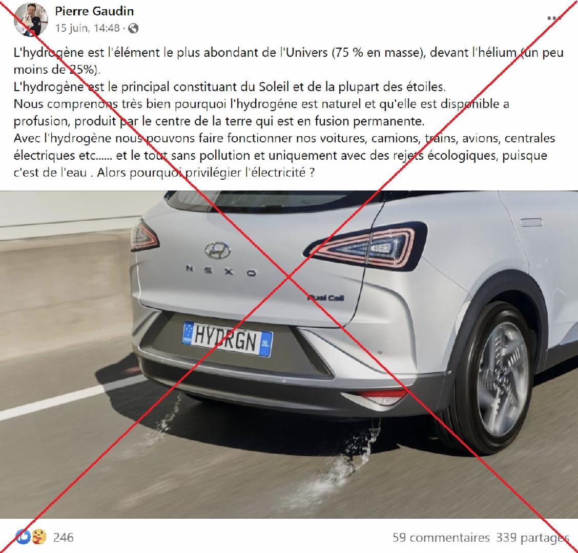 "Avec l'hydrogène, nous pouvons faire fonctionner nos voitures, camions, trains avions, centrales électriques etc......et le tout sans pollution et uniquement avec des rejets écologiques, puisque c'est de l'eau. Alors, pourquoi privilégier l'électricité ?", interroge l'auteur d'un post Facebook, publié le 15 juin 2022.