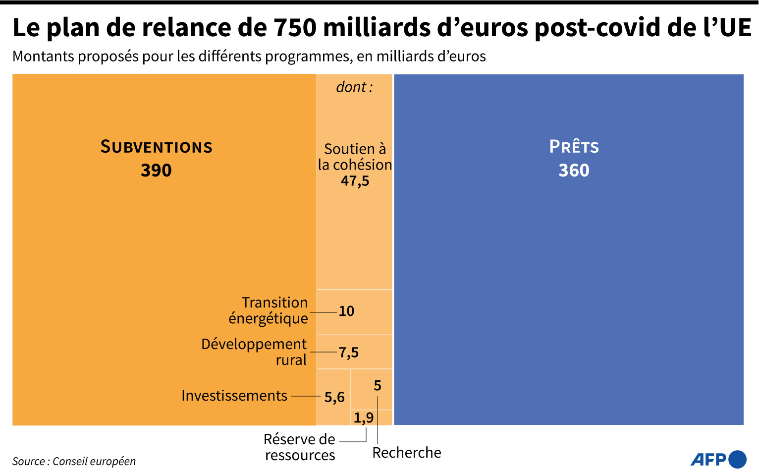 A l'issue de longues et épineuses tractations, les dirigeants des 27 pays de l'Union européenne avaient, en juillet 2020, arraché un accord historique sur un plan de relance de 750 milliards d'euros, financé pour la première fois par des titres de dette émis par la Commission au nom de l'UE et destiné à réparer les ravages économiques de la pandémie de Covid-19.