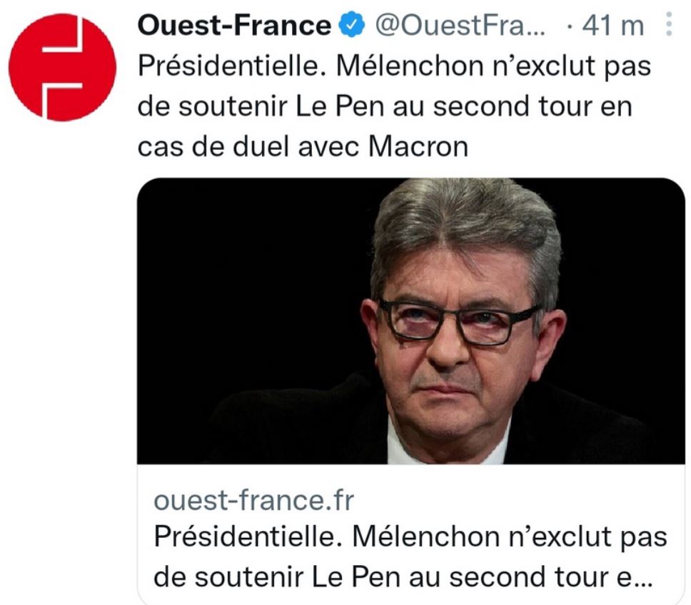 Certains tweets et publications appuient leur affirmation avec la capture d'écran d'un article partagé sur le compte Twitter de Ouest-France, et titré, à ce moment-là: "Présidentielle, Mélenchon n'exclut pas de soutenir Le Pen au second tour".