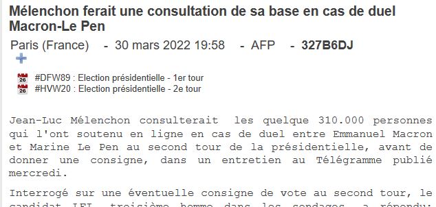 L'article publié sur le site de Ouest-France est une dépêche diffusée à l'origine par l'AFP le 30 mars à 19h58, qui a toujours eu pour seul et unique titre "Mélenchon ferait une consultation de sa base en cas de duel Macron-Le Pen".