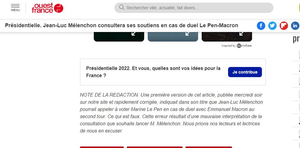 "C'est une erreur qui a été commise dans le titre. Le titre ne correspondait pas au corps du texte, qui lui était juste. La personne qui était au desk a voulu re-titrer une dépêche AFP et s'est trompé sur le titre", a expliqué à l'AFP la rédaction en chef de Ouest-France. Il a depuis été corrigé en "Jean-Luc Mélenchon consultera ses soutiens en cas de duel Le Pen-Macron".