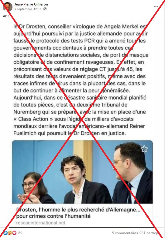"Le Dr Drosten, conseiller virologue de Angela Merkel est aujourd'hui poursuivi par la justice allemande pour avoir faussé le protocole des tests PCR qui a amené tous les gouvernements occidentaux à prendre toutes ces décisions de distanciations sociales, de port du masque obligatoire et de confinement ravageuses", affirme l'auteur d'un texte repris dans cette publication, partagée 931 fois depuis le 9 septembre 2021.