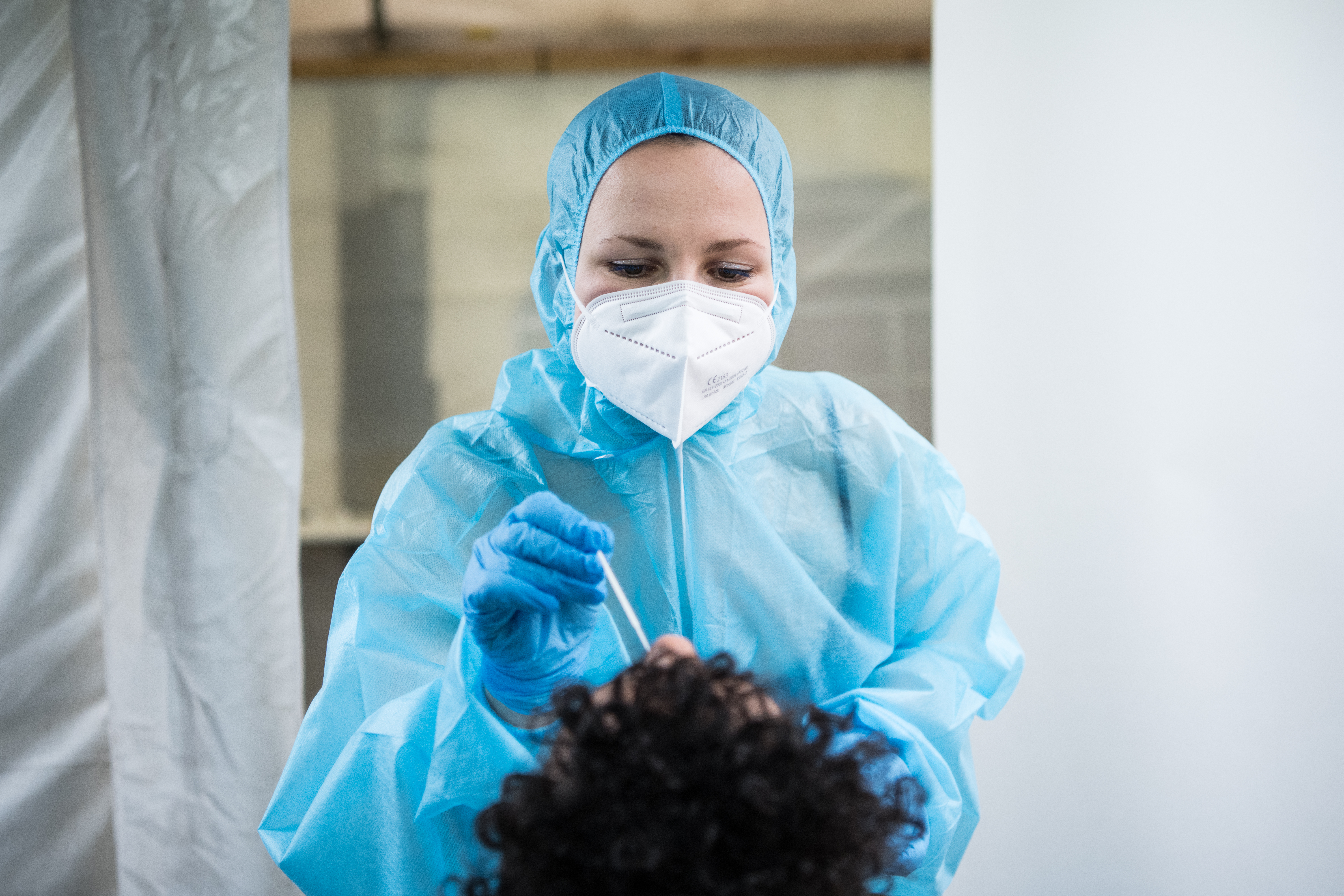 Une employée effectue un test de diagnostic du Sars-Cov-2 sur un patient, à l'extérieur de la boîte de nuit KitKatClub de Berlin, transformée en centre de test du coronavirus, le 23 décembre 2020 à Berlin ( AFP / STEFANIE LOOS)