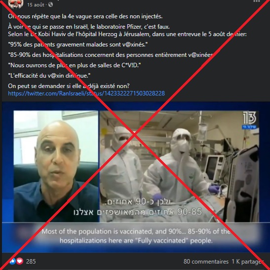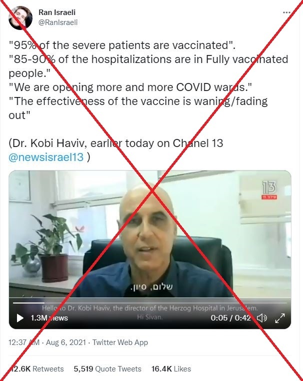 La vidéo d'un docteur israélien critiquant la vaccination contre le Covid-19, assortie de commentaires prétendant le citer en affirmant que "95% des patients gravement malades sont vaccinés", ou que le vaccin est "inefficace", a été partagée plusieurs milliers de fois sur les réseaux sociaux depuis août. Ces publications sont pourtant trompeuses : les citations attribuées à ce médecin sont, pour certaines totalement erronées et pour d'autres tronquées. Dans son interview complète sur une chaîne télévisée locale, ce médecin encourage la population à recevoir une troisième dose de vaccin.