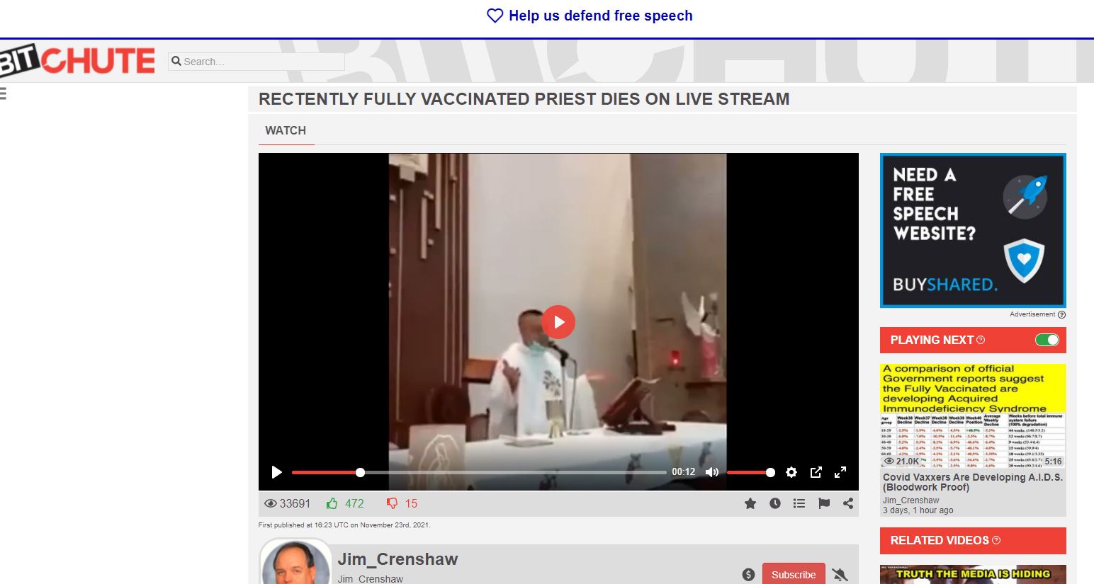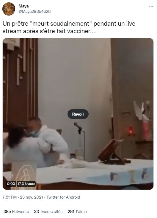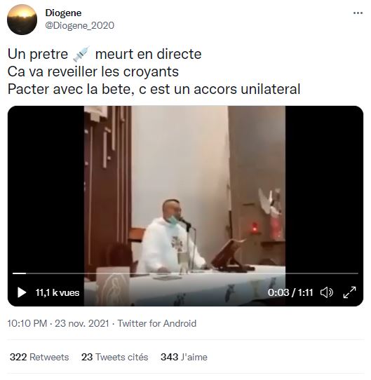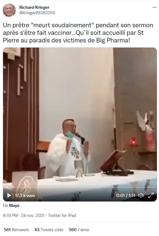 "Un prêtre 'meurt soudainement' pendant son sermon après s'être fait vacciner… Qu’il soit accueilli par St Pierre au paradis des victimes de Big Pharma !", ironise un internaute français dans un tweet accompagné de la vidéo.