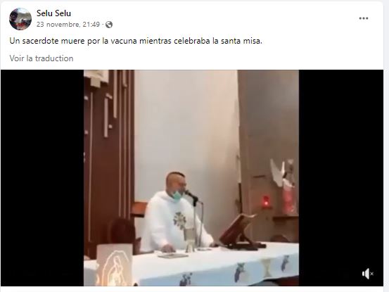 La vidéo a été partagée plus d'un millier de fois depuis le 23 novembre sur Twitter (1, 2, 3) ainsi que sur Facebook, avec des légendes indiquant à chaque fois que le prêtre serait "mort soudainement après s'être fait vacciner contre le Covid-19". Elle a également circulé en espagnol et en anglais (1, 2).