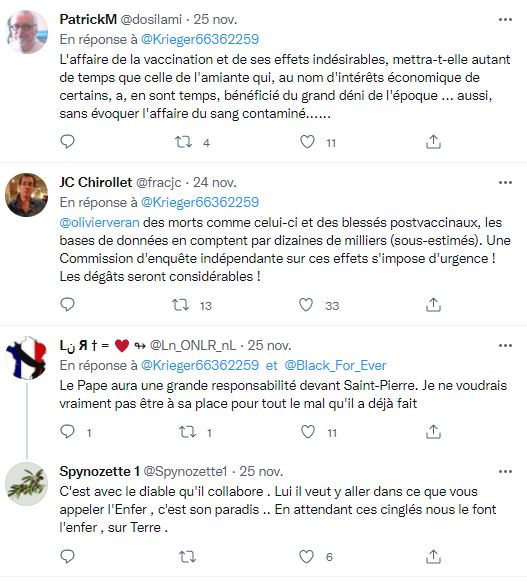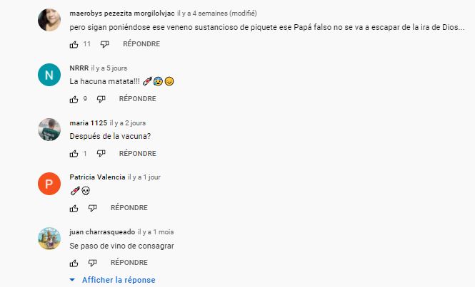 En commentaires, des internautes assurent que des "dizaines de milliers de victimes" seraient mortes de la même façon à cause des vaccins, et condamnent la position du Pape François qui avait incité les croyants à se faire vacciner au mois d'août.